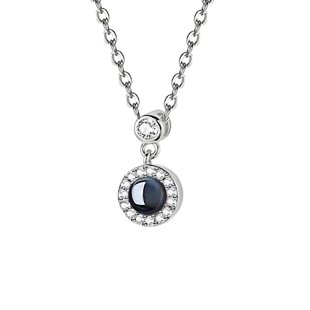 • カスタマイズ可能なダイヤモンドラウンドペンダント – パヴェセッティングのダイヤモンドがきらめく星空を描き、トップに輝く一粒のダイヤモンドが、明けの明星を思わせるダイナミックなタッチを添えます。ブラックサファイアの神秘的な輝きと、ダイヤモンドのまばゆいばかりの輝きが見事に融合しています。