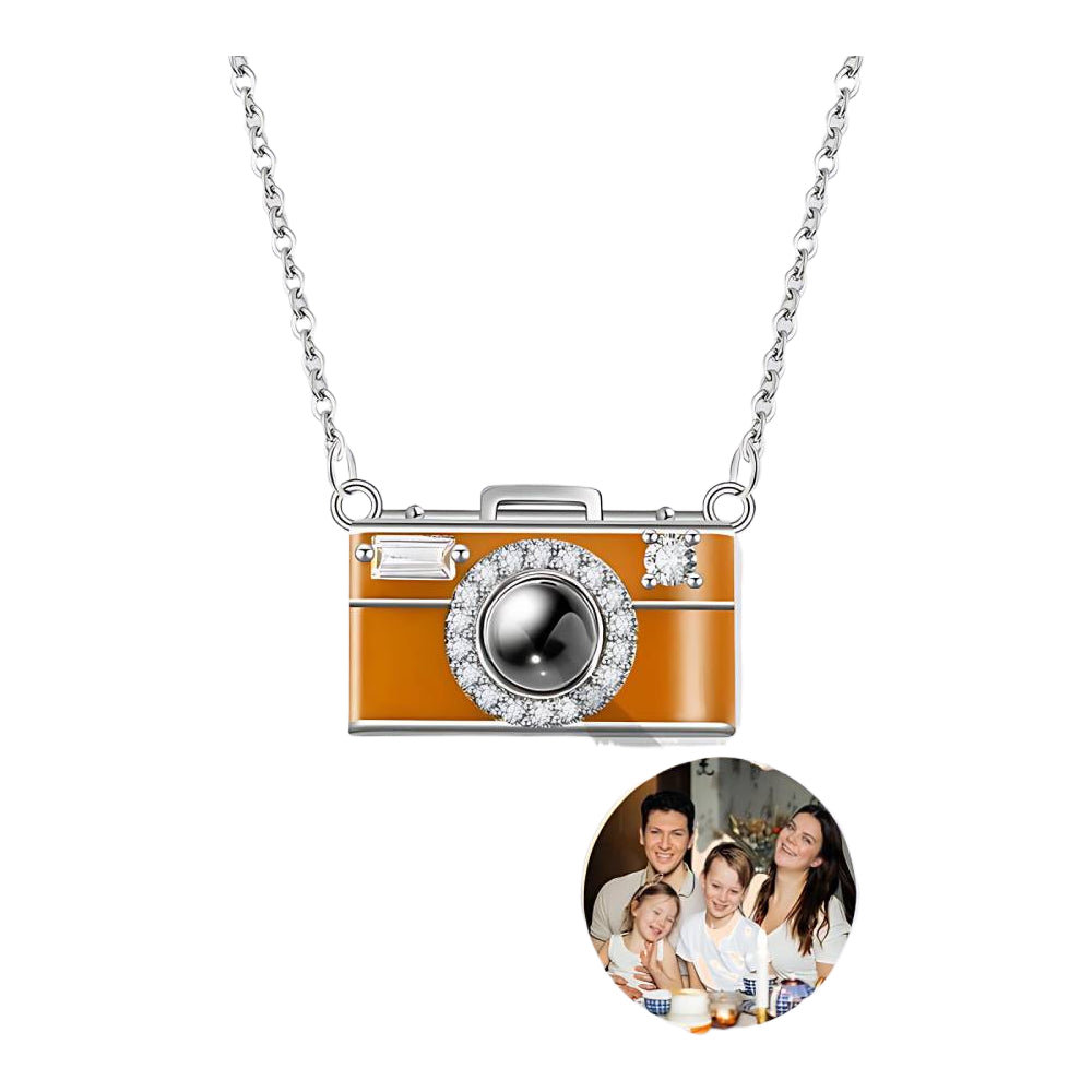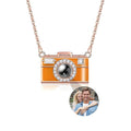 • カスタマイズ可能なカメラペンダント – このネックレスは、鮮やかなオレンジ色のヴィンテージカメラをモチーフにしています。遊び心のあるシルエットをローズゴールドのラインで縁取り、レンズをまばゆいダイヤモンドで囲み、シャッターを切る瞬間を永遠に捉えます。