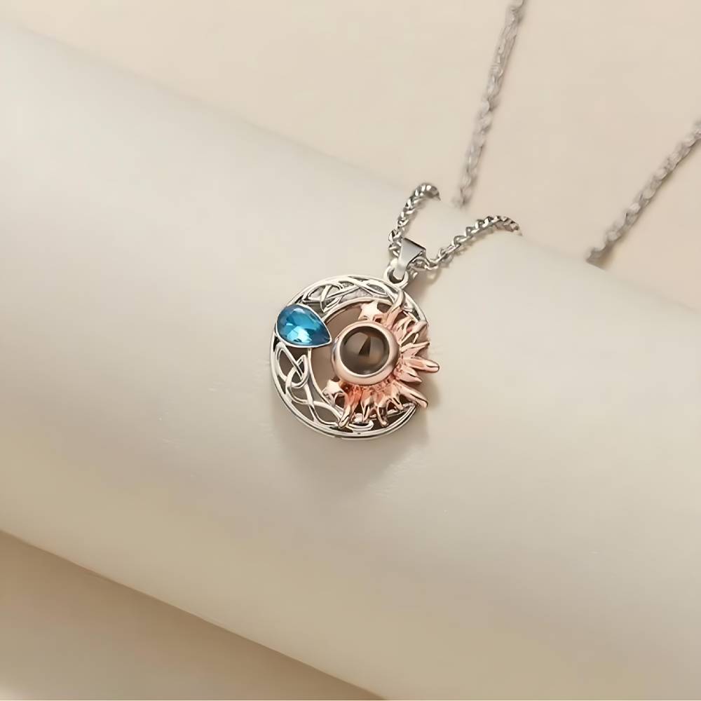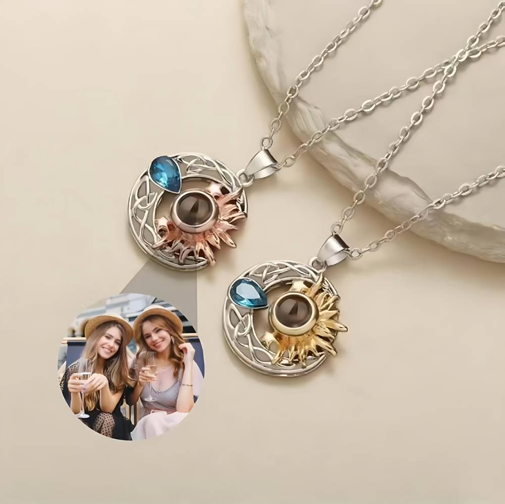 • カスタム サン&ムーン ペンダント – このネックレスは太陽と月を融合させ、光と闇のバランス、強さと優しさを象徴しています。左側には青いティアドロップ型の宝石があしらわれ、夜空の星の透明感と輝きを彷彿とさせます。